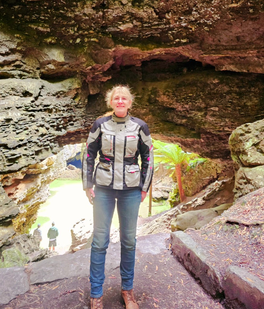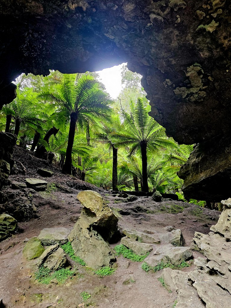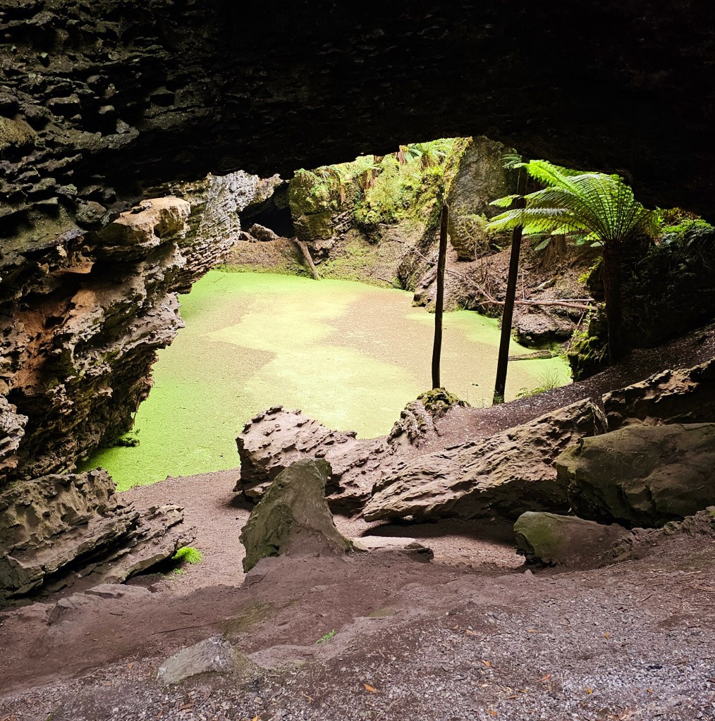 Next stop, Trowutta Arch. A short walk on well made paths through towering tree ferns and enormous trees. As I walked down the stairs and first saw the Arch, it took me a moment to actually believe it was real and not one of those film sets that I felt had been riding through. So picture perfect, formed from ragged rocks, framing a vibrant green pool of water and framed by almost fluorescent ferns and foliage.