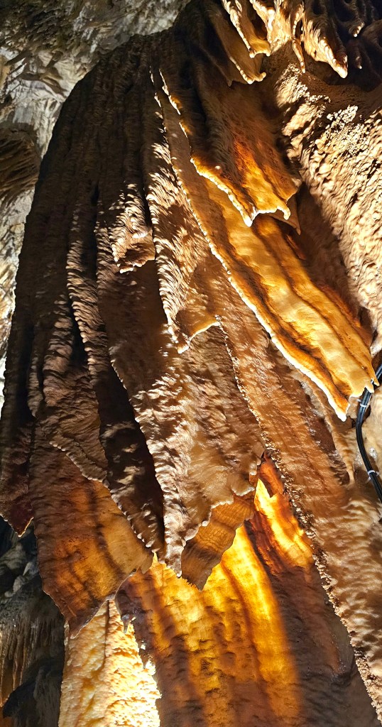 Clinging to the walls and ceiling are the ‘shawl or curtain’ structures that resemble swathes of fabric, draped elegantly in ripples and folds.
