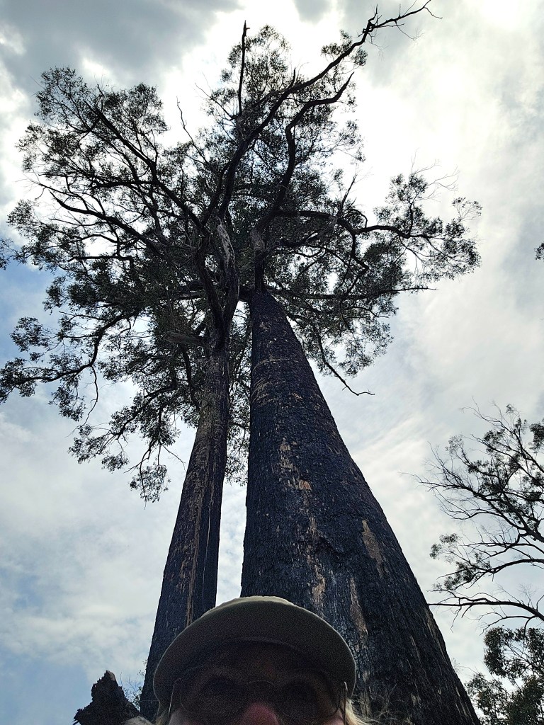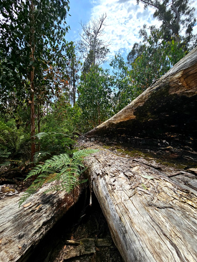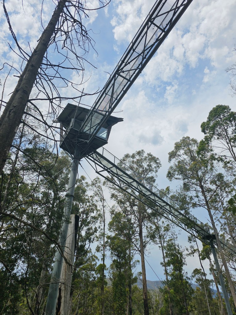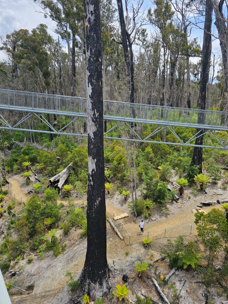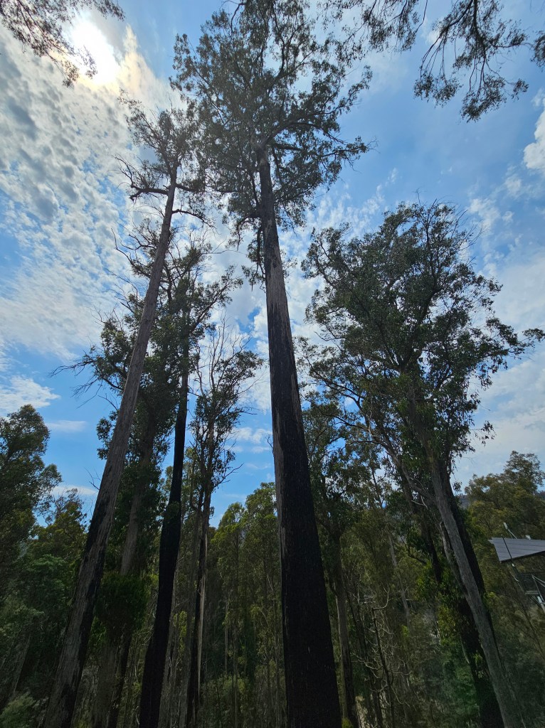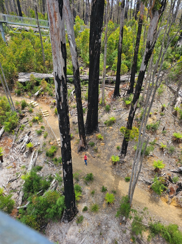 2019 saw a monster bush fire tear through the Tahune forest, burning over 63,000 hectares of the Huon region, devastating a lot of what I was walking through. Signs encourage you to look up and notice how far up the fire had damaged some of the trees. Flames had reached higher than 80 metres in some areas, evidenced by the blackened tops of some of the most immense trees.