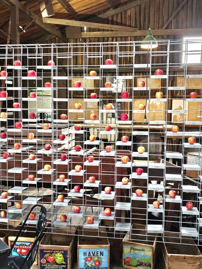 A wall of apple varieties that are used in cider making;